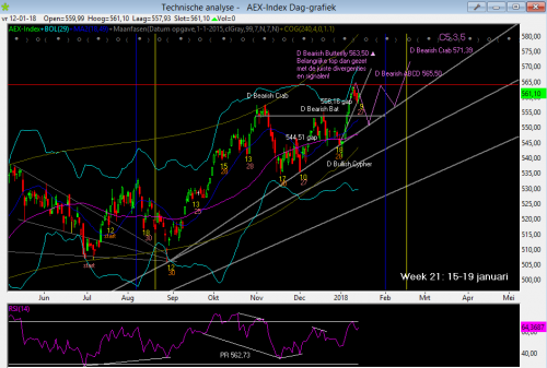 De AEX heeft inmiddels per de draaidatum (9 januari) een top gezet. Ook het aangegeven koersdoel van 563,50-565,50, kwam een heel eind overéén met de daadwerkelijke prijsactie. We zagen per 9 januari een intraday high van 563,31 (het hoogste punt in 2007 was 563,98). De echte high werd mijns inziens 9 januari nabeurs gezet aan het einde van de FTI sessie (rond 22:00 uur) met een slotstand van 563,55 in de FTI. Woensdag 10 januari werd een dubbele top gezet (563,30 intraday high) en daarna ging het begin van de daling als een speer waarna de rest van de daling zigzaggend volgde.