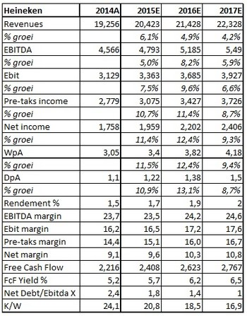 Het ziet er dus niet naar uit, dat 2015 een opwindend jaar voor Heineken zal worden. Voor de verbetering van de resultaten moet het bedrijf zwaar leunen op de reorganisatie van zijn structuur. Het bedrijf wordt gestroomlijnd en gebouwd rond 4 regio’s. Daar moeten de nodige besparingen uit voortvloeien die weer zichtbaar moeten worden in een verdere margeverbetering. Er is dit jaar nog een tweede mogelijkheid om de koers van het aandeel te stutten en om de beleggers te plezieren. Vijf jaar geleden nam Heineken het Mexicaanse FEMSA over. De Mexicanen verwierven toen een belang van 20% in Heineken. De zogeheten lock up periode loopt in 2015 ten einde. Het is de vraag wat de bierbrouwers gaan doen als dit pakket vrijvalt. Er is volgens insiders grote kans, dat de Amsterdammers het pakket in ieder geval gedeeltelijk zullen opkopen. De schuldpositie van het bedrijf laat een opkopen van het pakket in ieder geval toe. Ten slotte kan het bedrijf profiteren van een zwakke euro.