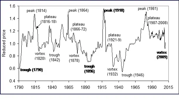 In het Reduced price-model volgt een herstel tot de DG-peak alvorens we omdraaien en lagere niveaus opzoeken, de trough genaamd. De trough zagen we eerder in 1790, 1842, 1896 en in de slotfase van de Grote Depressie in 1946. De tijdspanne tussen de vortex en de trough duurde de laatste drie keer respectievelijk 22, 18 en 14 jaar. Uitgaande van het laatste getal, 14 jaar, zou de bodem van deze crisis in (2009 + 14 =) 2023 liggen. Zie voor meer informatie ook het artikel “De rente als sluipmoordenaar”.