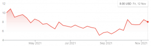 de derde week van augustus, waarin het nogmaals met 25% daalde. Sindsdien is Meatech echter aan een aanhoudende opmars bezig en staat het momenteel genoteerd op $8,-, weliswaar 20% onder de initiële startwaarde.