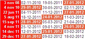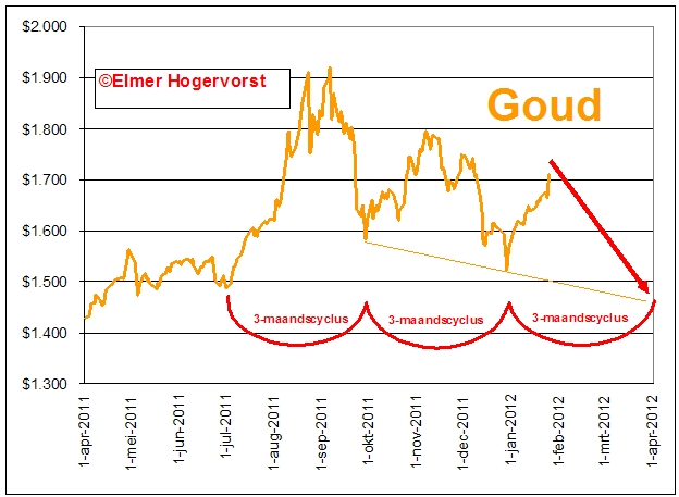 De goud- en zilverkoers lieten enkele weken terug flinke dips zien met belangrijke bodems op 29 december 2011. Goud bodemde op $1522 en zilver op $26. De bodem van goud op 29 december paste in de lijn van de 3-maandscyclus. Na een bodem eind juni 2011 volgde een bodem eind september 2011 alsmede een lagere bodem eind december 2011. Gezien het feit dat de bodems van september en december een dalende trend laten zien, is de meest waarschijnlijke optie – geen garanties – dat we eind maart 2012 een bodem (in plaats van een top) gaan maken. Zie hier de grafische weergave.