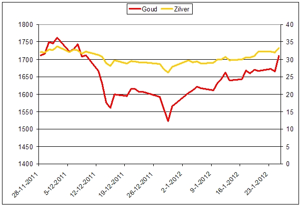 Sinds de bodem van eind december zijn goud en zilver aan een flinke opleving begonnen.