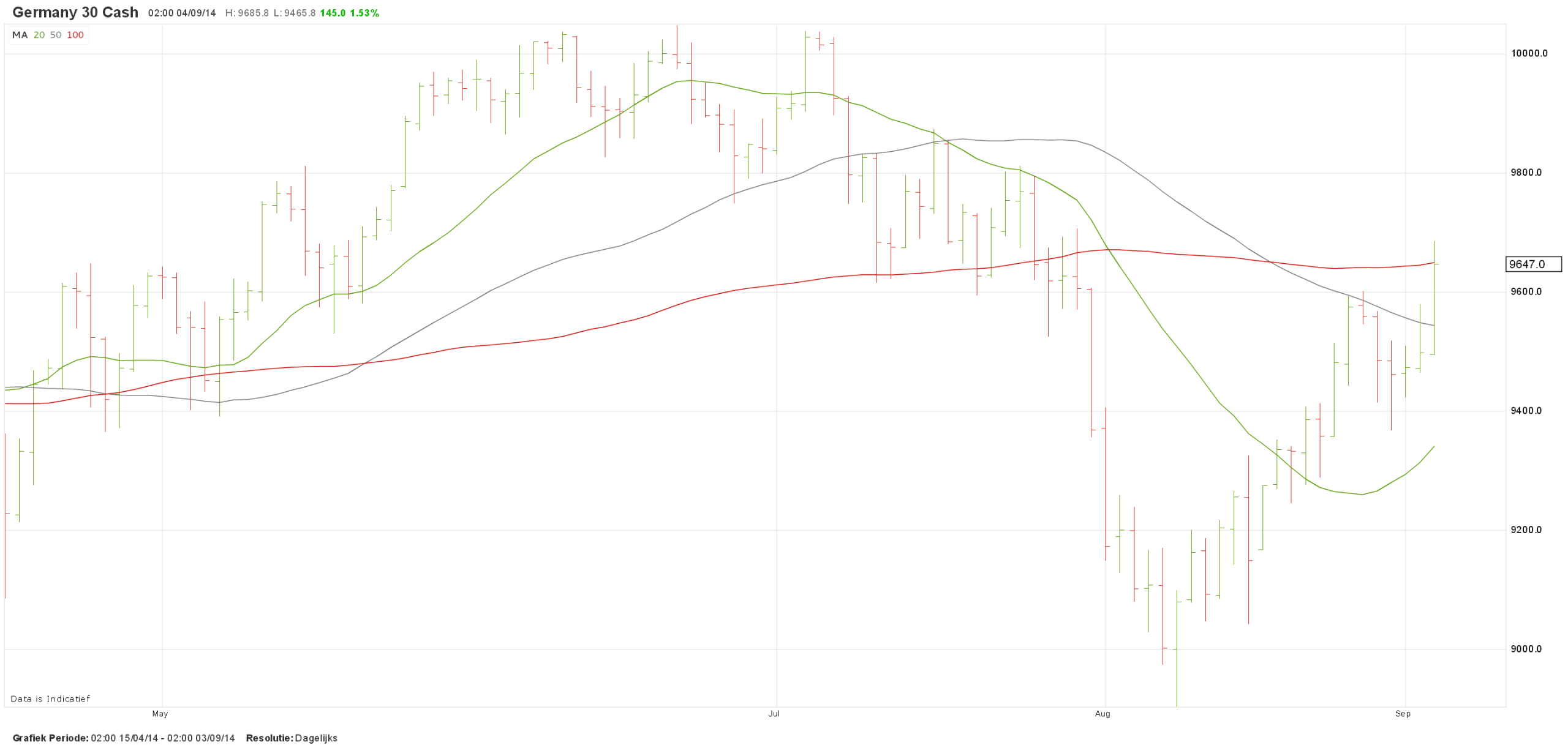 Gelet op de sterke stijging hebben wij vanochtend winst genomen met CritiTrader, onze service voor beleggers. We zijn gisteren ingestapt op de DAX op 9.525 punten en vandaag winst genomen op 9.600 punten. In 3 trades hebben we nu totaal 500 punten winst op de Duitse beursgraadmeter.