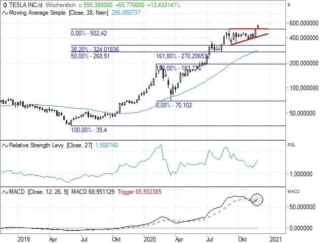 Sinds eind maart zijn de Tesla-aandelen meer dan verzevenvoudigd. Ondanks deze sensationele prestatie lijkt het einde van het verhaal nog niet te zijn bereikt. Met name het nieuwe record ($ 560) geeft een procyclisch signaal voor het kopen van investeringen.