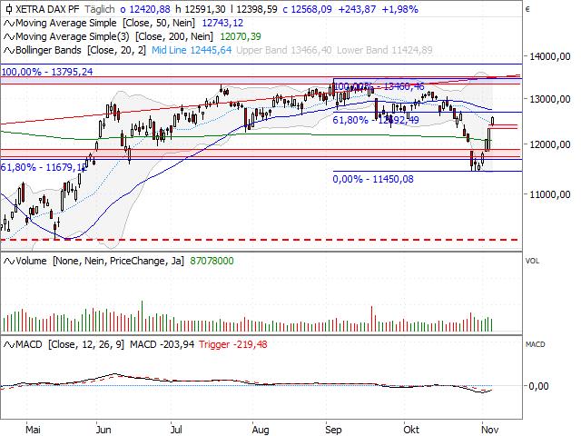 Tegelijkertijd konden de Duitse normwaarden de negatieve tegenhanger vanaf eind oktober sluiten. Naast de genoemde opwaartse kloof zorgt een nieuw MACD-koopsignaal voor extra rugwind. De volgende doelstelling vloeit nu voort uit de combinatie van de 61,8% correctie van de hele bearmarkt sinds begin september (11.692 punten) en het voortschrijdend gemiddelde van de 50 dagen (momenteel op 12.743 punten).