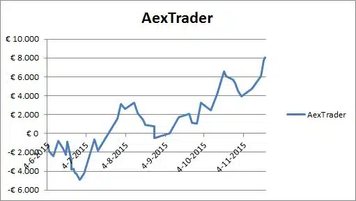 In zes maanden tijd is er een winst gemaakt van ruim 8.000 euro. Wilt u ook winstgevend beleggen zonder grote risico’s maar met een prima resultaat. Dan is AexTrader wat voor u. Uitgaande van 200 euro per AEX-punt wordt beoogd een winst te behalen van € 23.000 per jaar en gemiddeld per maand € 1.900.