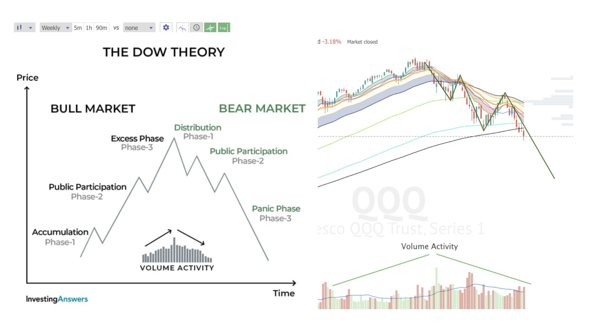 Bovenstaande grafiek is een ander voorbeeld hoe het kaf van het koren te scheiden waarbij volumes een cruciale rol spelen. Er is bij stijging sprake van accumulatie of koopdrift om vervolgens naar een distributiefase te gaan die doorgaans dus eindigt in paniek! Herkent u iets van de menselijke drijfveren angst en hebzucht?