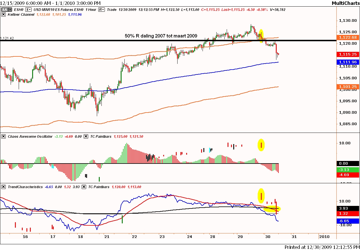 Ongeacht of u wel of niet uit uw positie bent gestapt, hebt u nu alsnog een kans op betere prijzen een neerwaartse positie in te nemen, want vandaag ontstaan er op uurbasis !! serieuze verkoopsignalen op de S&P 500. Natuurlijk is dit nog pril, maar op onderstaande uurgrafiek kunt u zien waarom de ‘case’ voor een shortpositie allengs sterker wordt.