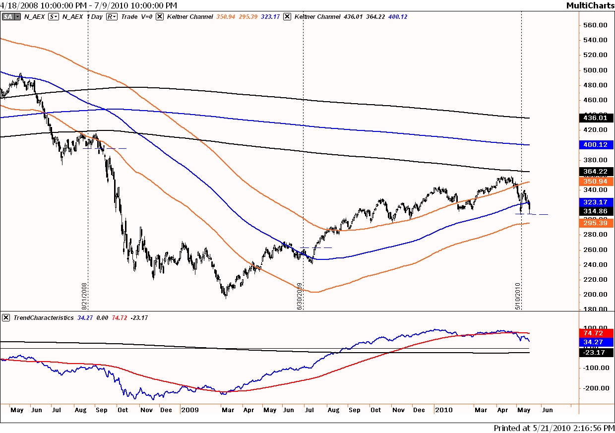 Vanaf de 2007-top in oktober, die patroontechnisch heel belangrijk bleek, heb ik telkens 314 (= 100 * 3.14 ofwel PI) kalenderdagen ingetekend. Zoals u ziet was er telkens aanleiding aan de vooravond van een significante beweging te staan. Gelet op het huidige slechte beeld..en..de significantie van de low van 6 mei….zullen koersen onder 308 een ware slachting mogelijk maken.