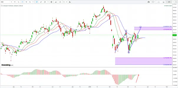 Als we kijken naar de Daggrafiek van de AEX, lijkt de ABC-correctie in de vorm van Wave 4 bijna voltooid te zijn. Dit wordt echter pas bevestigd zodra de Awesome Oscillator de nullijn kruist! Hier gemarkeerd met de rode pijl. Vervolgens krijgen we te maken met de (voor nu) finale Wave 5 die, zoals eerder gezegd, zijn bodem zal vinden tussen de 508 en 500 punten.