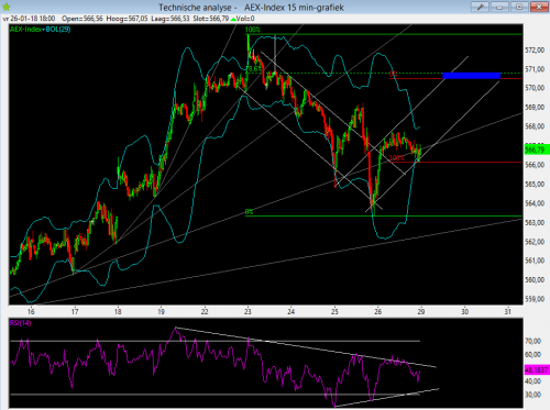 De oplettende lezer weet natuurlijk dat ik nu nog iets ben vergeten te vertellen. Wat verwacht ik nu eigenlijk precies per de 29/30 januari draai op basis van mijn uur systeem? Aangezien we een gap naar beneden hebben openstaan sinds woensdag 24 januari, verwacht ik dat we die gaan testen, maar niet opwaarts zullen breken op slotbasis. 570,60 Punten lijkt een logisch koersdoel (intraday) voor maandag/dinsdag. Als alles klopt, verwacht ik hier goed in te kunnen stappen op de ‘second chance’ top oftewel, de ‘dead cat bounce’ en in normaal Nederlands de lagere top. Misschien een leuke toevoeging om de 570,60 wat meer te onderbouwen, zie de volgende kwartier grafiek: