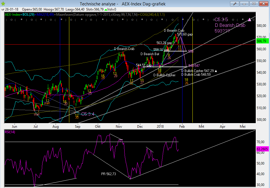 Ik weet dat u enorm uitkijkt naar de bodemdatum en het is eindelijk zover, ik zal het u vertellen (tromgeroffel), noteert u maar het volgende in de agenda: dinsdag 6 februari! Ik schat in dat de bodem ergens laat op de dag zal komen, maar dat blijft lastig om aan te geven. Als ik op de dag juist zit ben ik al heel blij! U weet dat ik naar 558 uitkijk maar minimaal naar 564. Gezien de daling van vorige week, waarmee we de 563,35 al hebben gezien, verwacht ik dat de 558 zeker haalbaar is voor de tweede dalingsgolf. Sterker nog, ik zie mogelijkheden voor een diepere daling! Het is dan wel noodzakelijk dat we door de 558,16 gap op slotbasis heen beuken en ook de 555-554 zone makkelijk te grazen nemen. 548-547 Ligt dan in het verschiet op basis van twee harmonische koerspatronen genaamd een Cypher en wederom een Crab patroon. Hoe meer van dit soort patronen naar een bepaald punt wijzen (Potential Reversal Zone), des te groter de kans dat we daar naartoe zullen bewegen en daar ook een draai in de markt zullen krijgen! Onder de 548-547 zone ligt overigens nog een sterke steun (de drie keer geteste 544,51 gap). Ook loopt hier een waaierlijn per de draaidatum en die zie ik niet zomaar gebroken worden. Met 558 zal ik persoonlijk al een zeer tevreden man zijn. Echter, met een heftige draaidatum als deze, weet je het nooit wat voor gekkigheid er kan komen! We bevinden ons in een markt van uitersten. Heel apart, maar het hoort er blijkbaar bij.