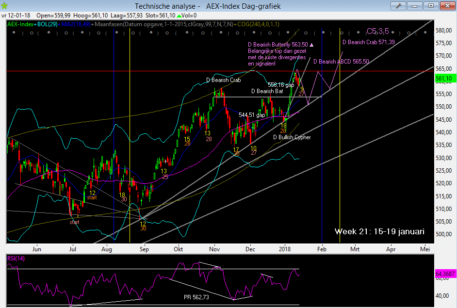 Mocht de koers voorbij de 565,50 schieten en daardoor geen van de twee geschetste scenario’s zich uitspelen, dan is de kans groot dat we toch nog de Amerikanen na gaan doen (gekke stijgingen aan de overkant van de plas terwijl Europa weer eens achterloopt) en ook loodrechte stijgingen uit de Hollandse mouw gaan toveren. De cycle low zal dan wel heel minimaal worden per 19 januari, maar dat zit mij niet lekker… Aan de andere kant heb ik de jaren negentig niet ‘beursbewust’ meegemaakt en heb daardoor weinig ervaring met een blow-off markt.