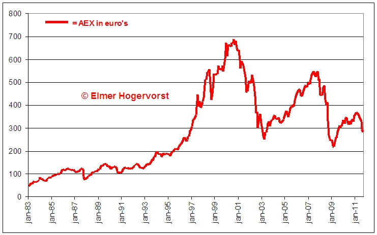 De vorige exercitie waarin ik de huizenprijzen corrigeerde voor de geldontwaarding leverde veel reacties op. Een lezer suggereerde om ook andere vermogenscategorieën eens onder de loep te nemen. Daarom deze keer de AEX.