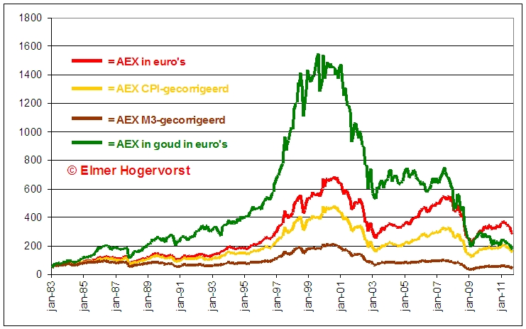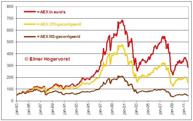U kent echter mijn kritiek op het CPI-cijfer. Aandelen- en huizenprijzen zijn niet in het cijfer verwerkt, terwijl we wel massaal geld bijdrukken voor de aankoop van woningen in de vorm van nieuwe hypotheken. Door heel simpel te kijken naar de toe- en afname van de ruimste, officieel gehanteerde, definitie van de geldvoorraad (M3) en daarmee van de monetaire inflatie krijgen we een veel beter beeld van de daadwerkelijke geldontwaarding. Zo ziet de AEX eruit wanneer we al het bijgedrukte geld uit de koersen elimineren: