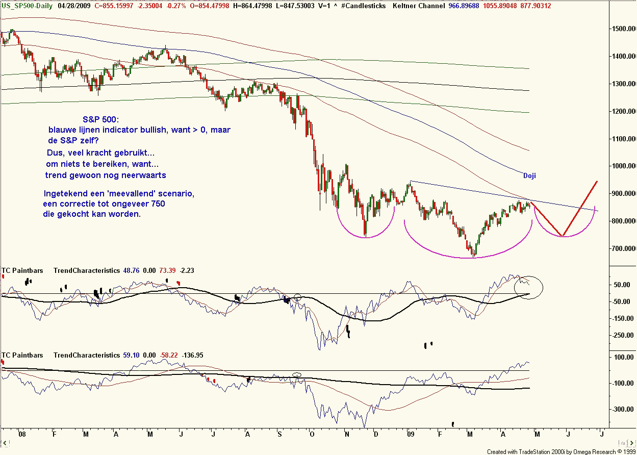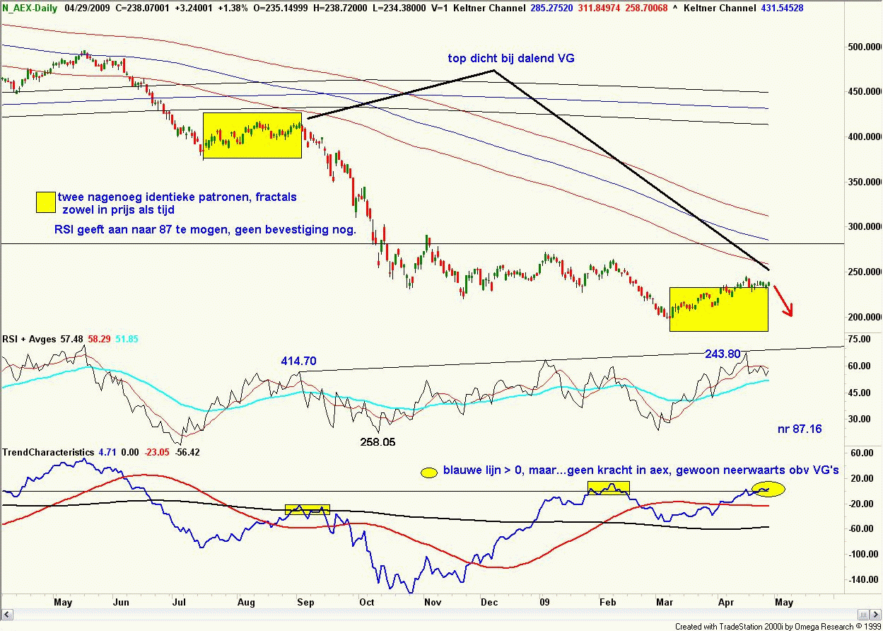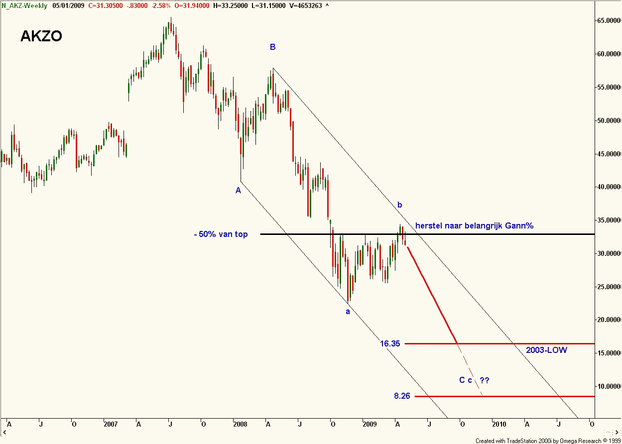 We zien een correctie opwaarts vanaf november 2008 die waarschijnlijk beëindigd is. Daarnaast brak AKZO uit boven een belangrijk VG, testte de uitbraak en plaatste een hoger slot. Vervolgens…boem…omlaag. Dat duidt er in ieder geval op dat de opwaartse beweging vanaf november gecorrigeerd gaat worden, maar…het mag veel erger worden en dat is nu precies het dilemma waar we mee te maken hebben.