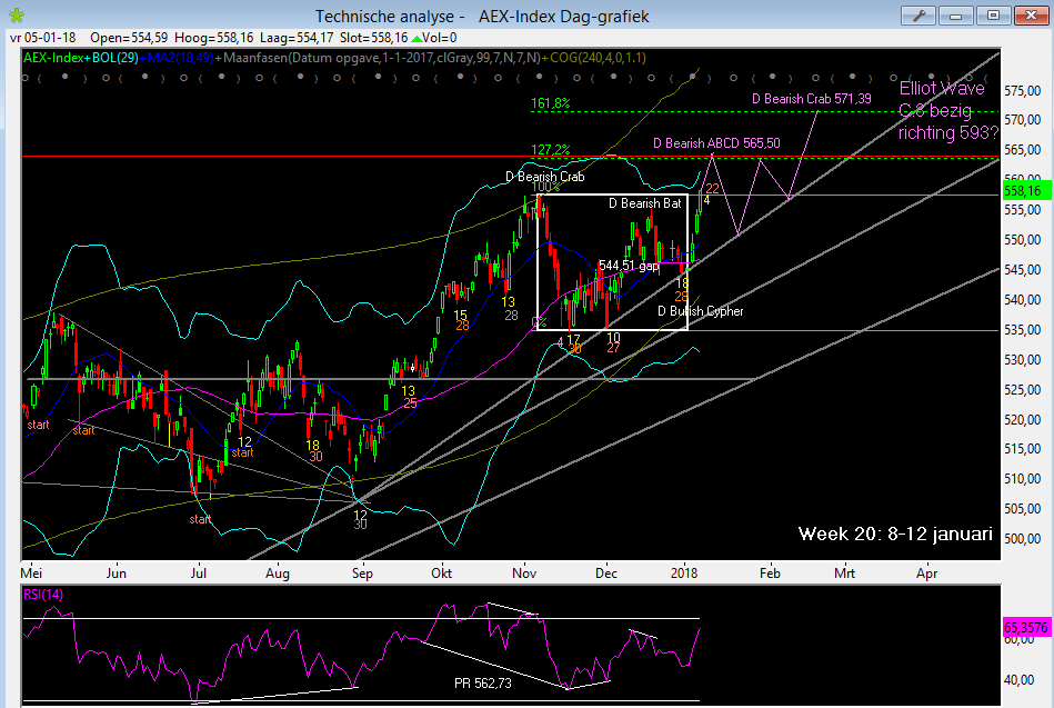 De AEX heeft inmiddels per de draaidatum (29 december) een duidelijke low gezet. Wie denkt ‘dat klopt niet want de low was per 2 januari’, verwijs ik naar mijn tekst over de draaidata aan het einde van de analyse. Op slotbasis klopt het perfect, op intraday basis inderdaad niet. Ook het aangegeven koersdoel van 543-541 uiterlijk indien we toch nog eerst zouden dippen alvorens te stijgen, kwam een heel eind overéén met de daadwerkelijke prijsactie. Voor de derde keer werd overigens de gap van 544,51 op slotbasis niet gesloten en dus is dat niveau een behoorlijke steun geworden inmiddels! Wel gingen we veel verder dan de 549,39 gap weerstand en daar had ik niet direct rekening mee gehouden.