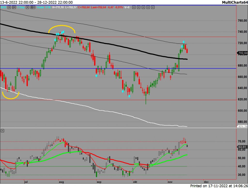 Als we de weekcandle tot slot er ook nog bij betrekken dan zal een slotprijs morgen (einde week immers) onder 561 tot een toppatroon leiden zoals een ‘shooting star’. Dan is het plaatje compleet om een mooie risk/reward te krijgen aangaande een SHORT-positie.
