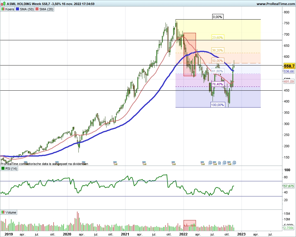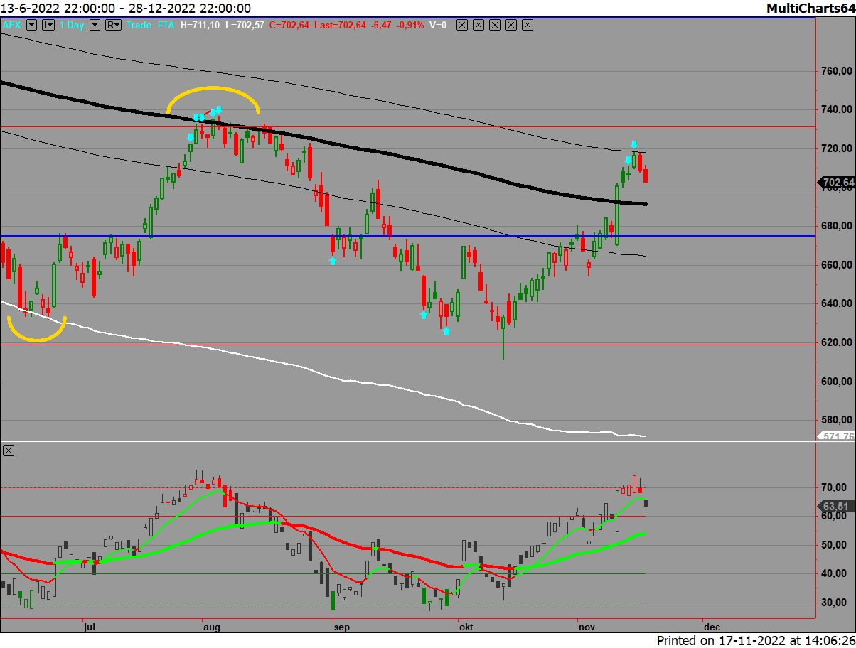Tegelijkertijd zien we dat de gehele AEX eigenlijk vooral door twee zwaargewichten wordt meegesleurd naar boven, te weten Shell en ASML. Over Shell schreef ik recent al en ASML zal ik vandaag technisch toelichten. Waarom? Omdat … als deze twee namen technisch ‘bullish’ zijn… we de stieren (voortgaande stijgingsfase) serieus moeten nemen.