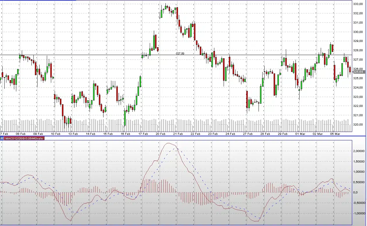 De AEX herstelde na de flink lagere opening maar moest in de middag alweer terrein prijs geven. Met CritiTrader zijn we short gegaan op de AEX bij een stand van 327,35. U kunt in de bovenstaande grafiek zien dat op die stand de daling begon.