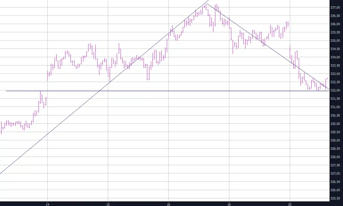 Vanochtend dook de AEX omlaag om steun te vinden bij 332. Daarmee lijkt het gat van 13 maart gedicht te zijn.