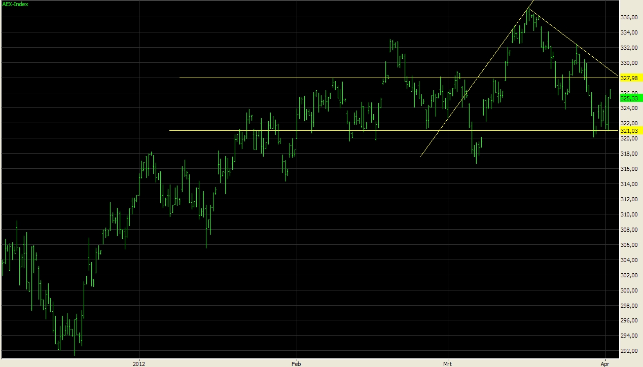 Wij voorzien een verdere opmars naar de 328 punten zolang de steun op 321 niet gebroken wordt, zie onderstaande grafiek. Al met al een beperkt opwaarts potentieel. Mocht de beurs boven de 328 stijgen dan voorzien wij een verder herstel naar de 330 punten.