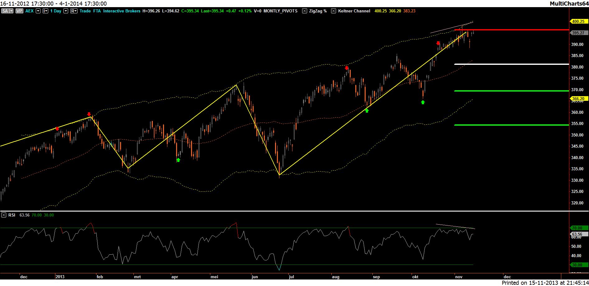 De AEX heeft recent een waarschuwingscandle geplaatst bij weerstand, die waarde krijgt indien de AEX onder 388 duikt.