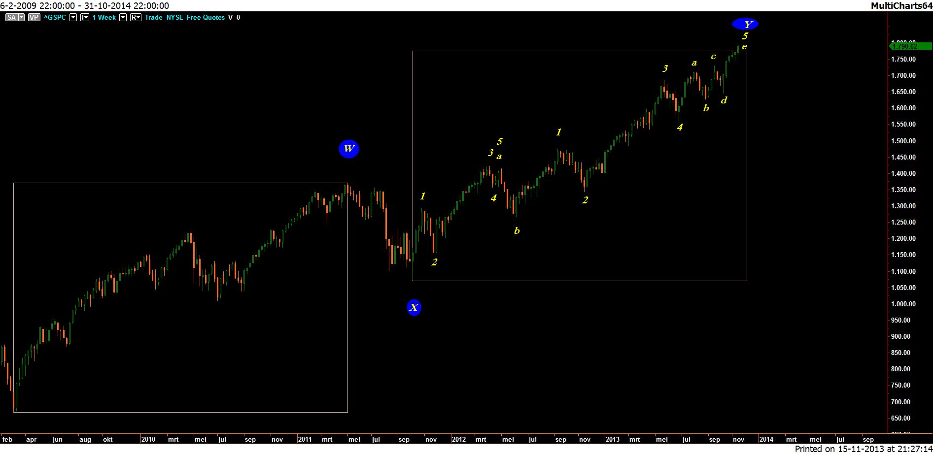 Qua tijd mag de S&P nog tijd rekken in een opwaarts scenario, maar qua patroon moeten we rekening houden met een overshoot opwaarts nu. De a,b,c,d en e maken waarschijnlijk deel uit van een eindigend patroon waarbij de e een opwaartse break realiseert…..en vervolgens vliegensvlug met kracht ongedaan maakt. Of het dit gaat worden, ik weet het niet, maar houd er rekening mee. Het sentiment is er rijp voor in ieder geval.