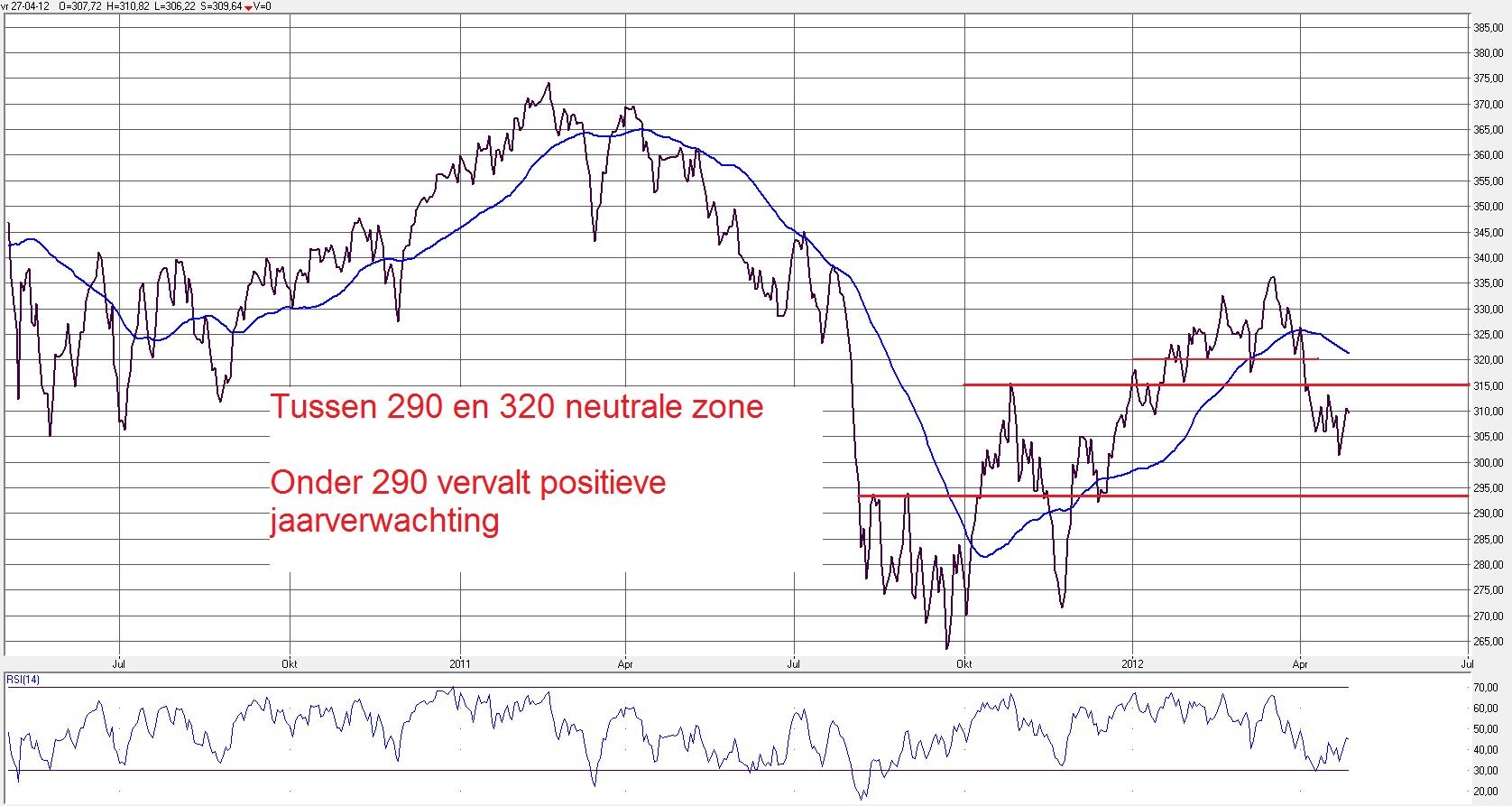 We zien dan dat na een goede start van 2012, een voortzetting van de eindejaarsrally 2011, topvorming ontstond boven 320 met een voorlopig year high rond 336. Hierna zakte de beurs vanaf medio maart weer weg tot onder de 320 met voorlopig year low rond 300. Met een beetje goede wil kan er een soort kop-schouder formatie in worden herkend, wat de index dalingsruimte tot circa 292 geeft.
