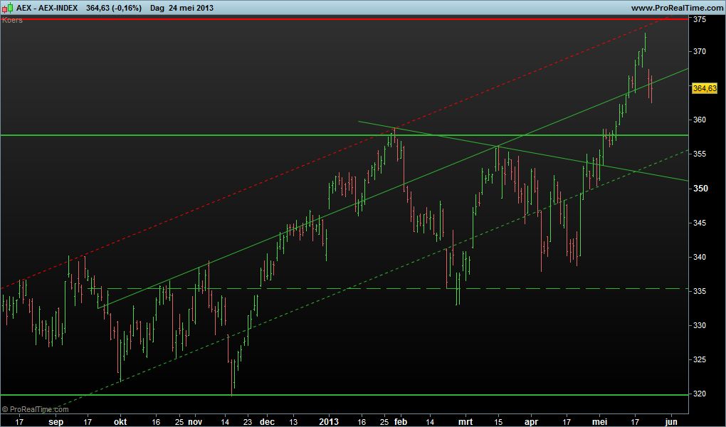 Vorige week schreef ik: “Ik handhaaf mijn mening dat we spoedig een flinke correctie gaan krijgen. In een golf 5 beweging blijven kopers kopen daar waar geen verkopers meer zijn.” Die correctie heeft inderdaad plaatsgevonden. De Amsterdamse beursgraadmeter vond weerstand op het belangrijke niveau van circa 373 punten. De opgaande trend op korte termijn lijkt nu gebroken te zijn. Het wachten is nu een op een lagere top dan de 373 punten. De correctie begint dan pas echt vorm te krijgen. Op korte termijn is dus herstel te verwachten.