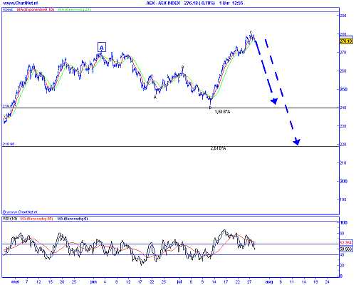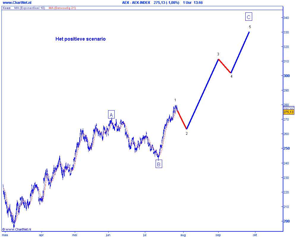 Voor de korte termijn is er sprake van topvorming in de AEX, een daling tot 265-260 is dan ook zeer aannemelijk. Is de markt in staat hier een bodem te vormen dan is scenario II voor mij preferent, de nieuwe opgaande fase is dan inderdaad op 13 juli van start gegaan.