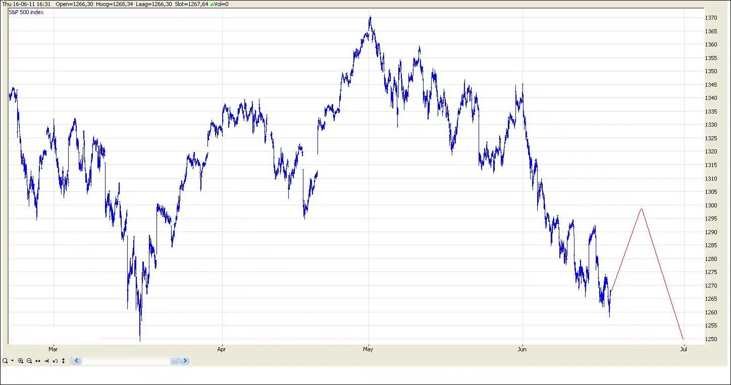 Voor de korte termijn verwacht ik dat de S&P 500 rond 1250 een tijdelijke bodem gaat vormen. Zoals het er nu naar uit ziet is de daling sinds begin mei een puls, die na een herstel, tot lagere koersen zal leiden. Met het innemen van een short positie zou ik dan ook wachten op een herstel tot het gebied 1300-1330. De daling die zich vervolgens naar verwachting zal ontwikkelen, is in de meeste gevallen heftig qua karakter. Wat betreft China kan ik stellen dat dit niet meer een beurs is om geld in te beleggen. Ook in deze markt is zichtbaar dat de komende tijd de koersen dalen.