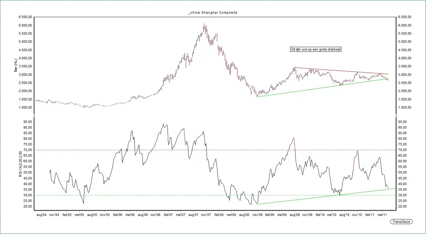 Vanaf eind 2008 beweegt deze index binnen de grenzen van een driehoek. Dit patroon in nu neerwaarts doorbroken en dat voorspelt niet veel goeds. Ik zie het als een consolidatie van dit jaar voorafgegaan door een daling. Met andere woorden, de neergaande trend zou nu hervat kunnen worden. China is in mijn ogen niet meer the place to be.