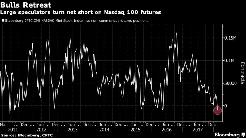 Hedgefondsen en andere grote speculanten zijn het eerst in 21 maanden netto short gedraaid op de Nasdaq 100 Index-futures. Dat is het meest pessimistische stemming sinds 2011. Dat blijkt uit de wekelijkse gegevens verzameld door de Commodity Futures Trading Commission tot en met 13 februari. In feite werden ze de meest bearish sinds 2011. Intussen  won de technologie beursgraadmeter 5,6 procent in de vijf dagen tot en met vrijdag, het meest sinds oktober 2014.