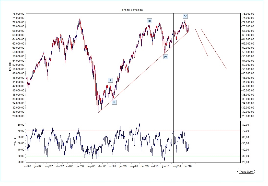 De Bovespa is na een herstel weer aangekomen bij de opgaande steunlijn. Een daling onder deze lijn is een signaal dat de stijging sinds eind 2008 is beëindigd en dat een correctie over deze stijging is gestart. In een normale situatie zou deze correctie een daling op kunnen leveren tot 56.000 mogelijk 50.000 punten in de Bovespa.