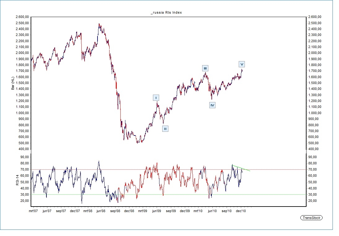 De Russische beurs is op dit moment het sterkste van het kwartet. Door de divergenties in de RSI is het potentieel om te stijgen beperkt in deze markt en is een periode van topvorming waarschijnlijk.