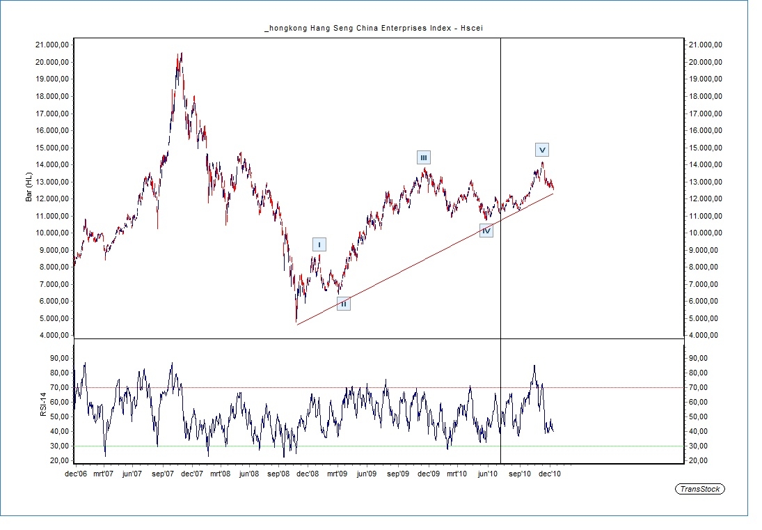 De HSCEI (=De Hang Seng China Enterprise Index: bestaat uit een aantal Chinese bedrijven welke geregistreerd staan op de beurs van Hong Kong) is ook aangekomen op de stijgende trendlijn, een verkoopsignaal is dus nog niet gegeven. Ook is er in deze index nog geen sprake van divergenties. Echter er is wel een complete beweging waar te nemen in de vorm van een vijf structuur. De kans dat zich een correctie gaat ontwikkelen neemt dus wel toe.