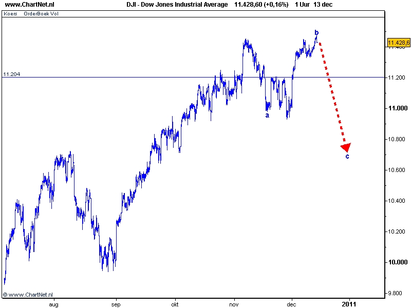 De gevaren zitten vaak in een klein hoekje, In de Dow Jones zit zo’n potentieel gevaar. Eind november is er in deze index een lagere bodem geplaatst. Deze bodem kan een golf b zijn van een irregular correctie. Consequentie van dit patroon is dat we eerst nog een forse daling voor de kiezen krijgen voordat de stijging weer inzet. Indien dit beeld juist is zou er in de Dow Jones zelfs een daling tot 10.700 verwacht mogen worden. Voordat dit scenario aan realiteit wint, is er een daling nodig onder 11.250.