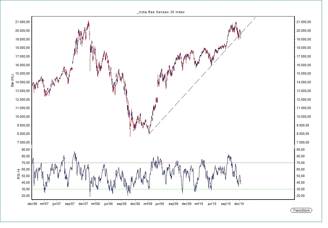 Na een periode van twee jaar waarin de koersen van de BRIC ´s op indrukwekkende manier zijn gestegen, lijkt een correctie aan te breken in deze landen. Met name India is de afgelopen tijd verzwakt. De opgaande trend is daar aan het breken. Is een periode van correctie in deze groeilanden aangebroken?