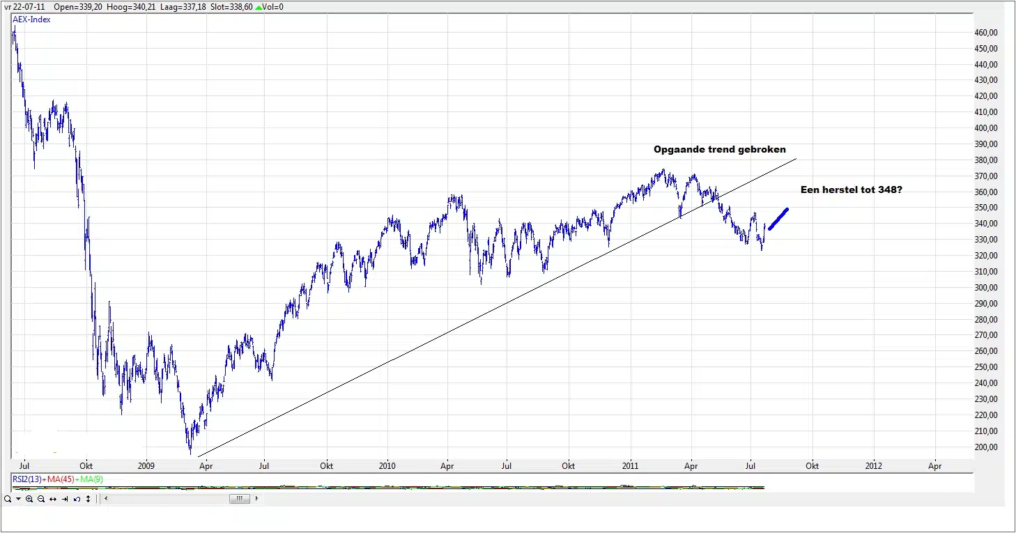 Ik houd er rekening mee dat de AEX nog een terugtest (pullback) dient te maken naar de door jou in de grafiek ingetekende langlopende steunlijn onder de opwaartse beweging die sinds maart 2009 is ingezet, maar waar we in juni 2011 zijn doorgevallen. Hoe langer momenteel wordt aangemodderd en getalmd, hoe hoger ze oploopt om ze opnieuw te pakken te krijgen.