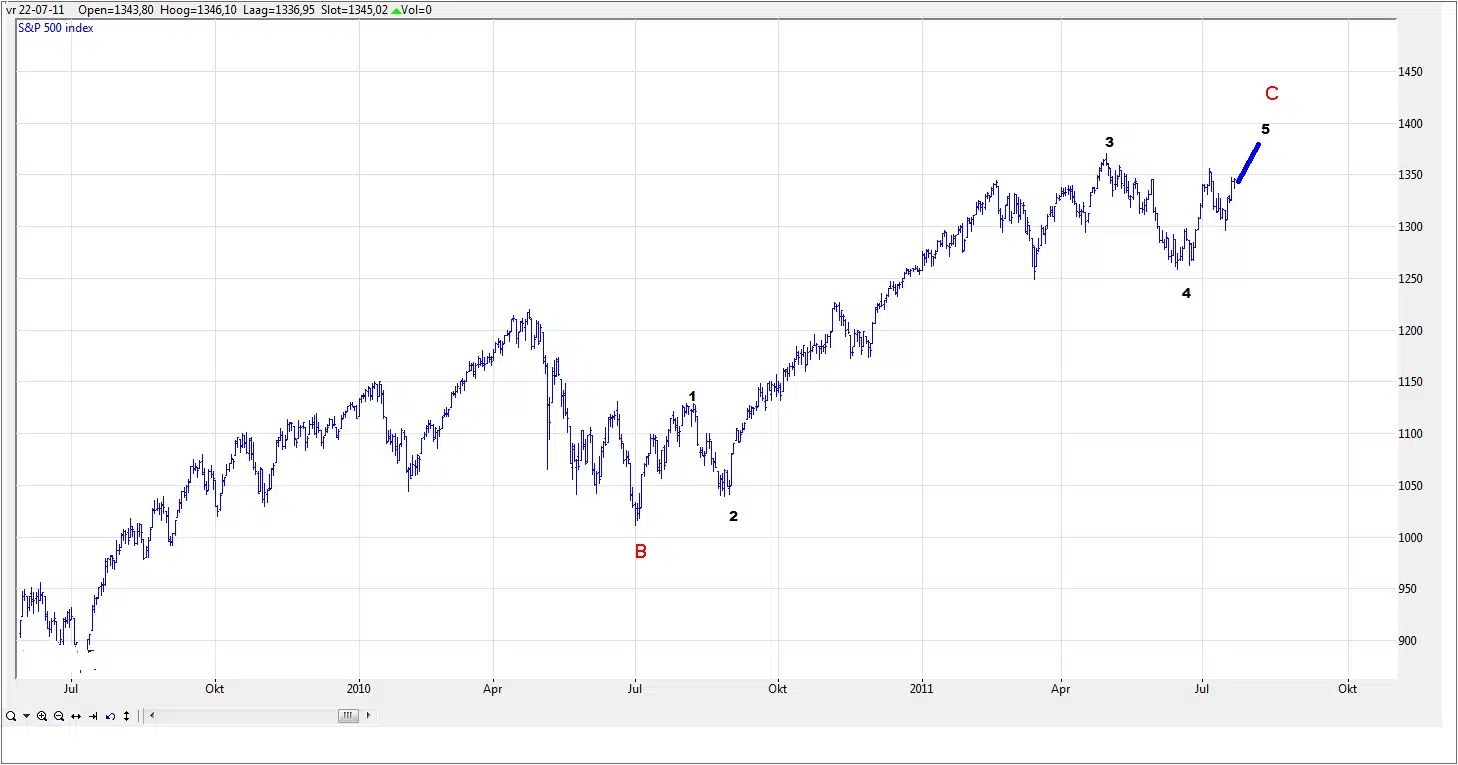 Mogelijk dat we de komende dagen/weken nog een nieuwe top gaan zien in de S&P 500. De stijging sinds de bodem op 23 juni is wat ver gegaan en geeft aan dat er nog kracht in de markt zit. Of de markt krachtig genoeg is om ook nog een nieuwe top te maken is op dit moment niet duidelijk maar we moeten er wel rekening mee houden. De gehanteerde telling wordt dan iets anders waarbij we nu in golf 5 zitten. Voor de middellange termijn hoeft deze wijziging geen gevolgen te hebben anders dan dat de versnelling van de daling nog even op zich laat wachten. Als we echter de komende dagen al een daling inzetten tot onder 1315 en vervolgens onder 1300 zakken, dan is in mijn ogen de kans op een hogere top verkeken en is de huidige stijging slechts een herstel gebleken.