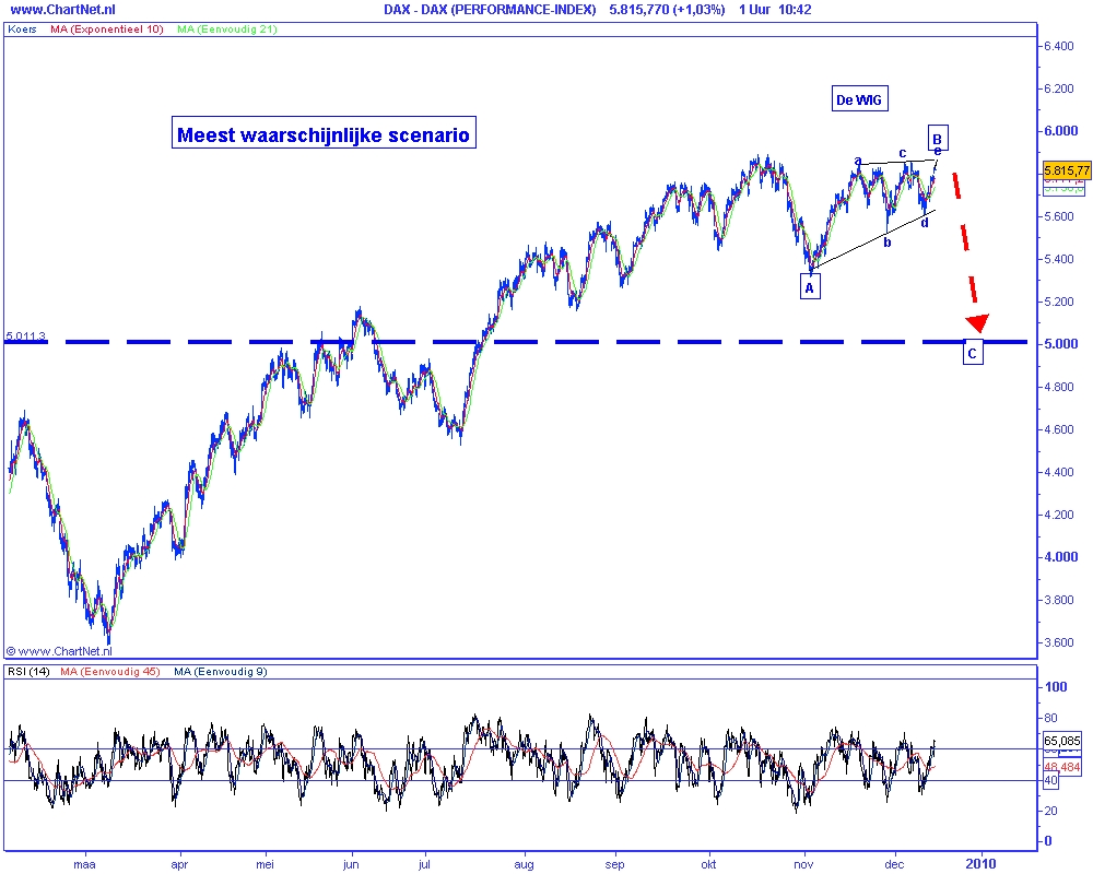 Een uitbraak heeft nog niet plaats gevonden, daar is het wachten nog op. Hoewel de kansen op een daling in mijn ogen het grootst zijn, dienen we altijd met een open blik naar de beurs te kijken. Door de stijging van de afgelopen dagen kunnen we namelijk te maken hebben met een driehoek. Deze driehoek is in de meeste gevallen een onderbreking van de trend. Een stijging boven 5900 is een signaal om verdere stijgingen te verwachten. Maar meer waarschijnlijk is dat we met een wig te maken hebben. Binnen deze wig is er voor de DAX nog ruimte voor een stijging tot ongeveer 5880. Indien zich vanaf dat punt een daling inzet en vervolgens ook de steun op 5600 punten weet te breken, dan is vrijwel zeker een felle daling te verwachten tot in eerste instantie 5000 punten in de Duitse DAX.