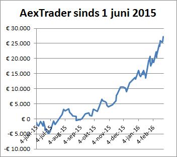 De beurzen twijfelen welke weg te nemen. De verzwakkende wereldwijde economie gooit roet in het eten. Grote uitslagen zijn aan de orde van de dag. Wij hebben de afgelopen maanden hiervan fors geprofiteerd door in te spelen op de beweeglijkheid. Met AexTrader, ons handelssysteem die automatisch signalen afgeeft, hebben we zeer goede zaken gedaan. We hebben geprofiteerd van de daling van de afgelopen dagen en pakten bijna 8 punten oftewel € 1.544. Daarmee hebben we sinds juni van vorig jaar een winst behaald van 136 punten oftewel ruim € 27.000 bij een startkapitaal van € 15.000. Zie onderstaande grafiek.