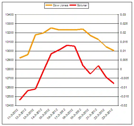 Het Solunarmodel van de Dow Jones was de afgelopen twee weken duidelijk: stijgen tot (zaterdag) 17 maart en dalen tot 23 maart. Deze voorspelling kwam perfect uit. Zie hier het model met de slotkoersen van de Dow Jones: