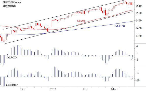 Het ziet ernaar uit dat Cyprus weer bij zinnen gekomen is. De Amerikaanse markten namen daar reeds een voorschotje op. Een en ander betekent dat de reactie weer op zijn einde loopt. Hij is kort gebleven maar hij heeft voldoende lucht in de markt gepompt zodat de koersen een volgende stijging kunnen inzetten. Wij laten u hieronder de daggrafiek van de S&P500 zien.