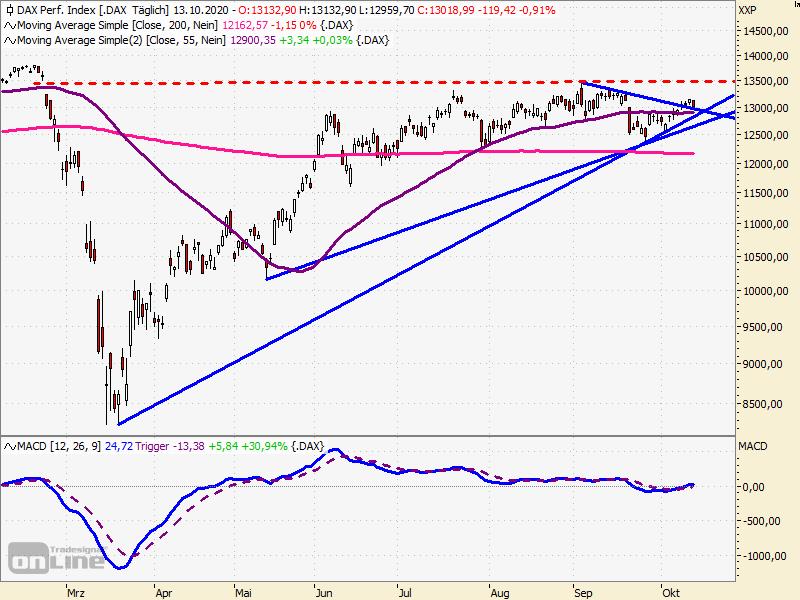 De Duitse blue chip-index handelt dus nog steeds niet alleen boven de doorbroken neerwaartse trendlijn, maar ook boven het 55-dagengemiddelde, dat belangrijk is op middellange termijn en in het bereik van 12.900 ligt. De belangrijke stijgende trend van zeven maanden loopt daar niet ver onder en een andere, vlakkere trend ligt momenteel rond de 12.690 / 12.727 punten. Dit is een stijgende trendlijn die precies vijf maanden oud is. De belangrijkste ondersteuningen worden genoemd en aan de bovenkant is de 13.150-zone de eerste belangrijke hindernis. Het hoogste punt in zeven maanden op basis van een slotkoers van 13.255 punten en vooral de enorme weerstandszone tussen 13.460 en 13.500 punten zijn ook belangrijk.