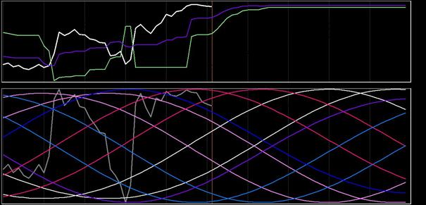 De koersgrafiek (wit) toont het koersverloop van de DAX van de afgelopen 4 handelsdagen. Van de vier cycli zie je zowel het historische als het toekomstige verloop (1 dag vooruit).