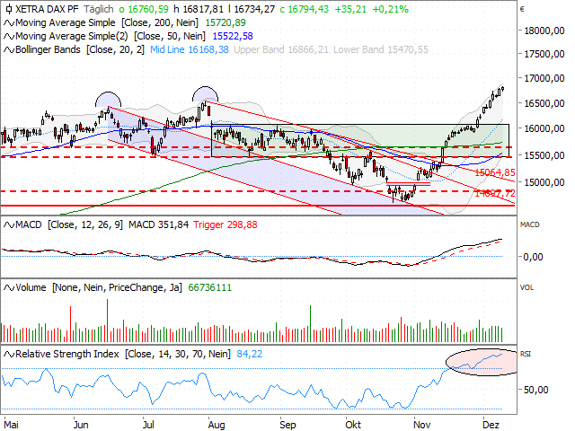 De DAX begon de voorlaatste volledige handelsweek van het jaar met een klein verschil tussen het hoogste en het laagste punt van minder dan 100 punten. Ondanks dit kleine bereik bereikten de Duitse standaardwaarden (de grootste en meest verhandelde bedrijven in Duitsland) opnieuw een nieuw record aller tijden van 16.818 punten.