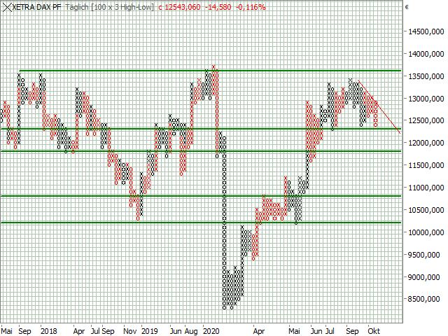 In dit verband is het interessant om de Point & Figure Chart van de DAX te bekijken. In het geval van een daling onder het dieptepunt van september, zou er ook een shortsignaal optreden in deze kaartweergave. Aan de andere kant is het nodig om hier de 13.000 te herwinnen, om de technische uitgangspositie stabiliseren. Aan de positieve kant, harmonieert de P&F chart heel goed met de 50-dagen lijn (momenteel op 12.930 punten) en de meest recente “swing high” op 13.029 punten. Het herstel dat gisteren begon, zet de DAX waarschijnlijk vandaag voort. Er is dus een kans op een verder herstel.
