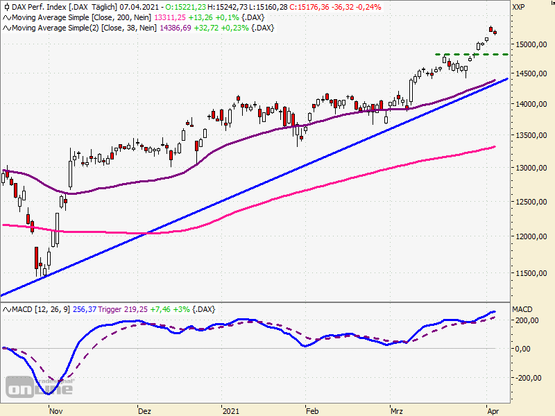 De uitbraak na Pasen met zijn hoogste punt ooit en op korte termijn een negatieve dagelijkse candle heeft nog niet tot een grote correctie geleid. Het was woensdag gisteren extreem stil met een handelsmarge van 82 punten of 0,5 procent en de DAX liep tegen het gat aan dat van donderdag tot dinsdag was gescheurd, d.w.z. tijdens Pasen.